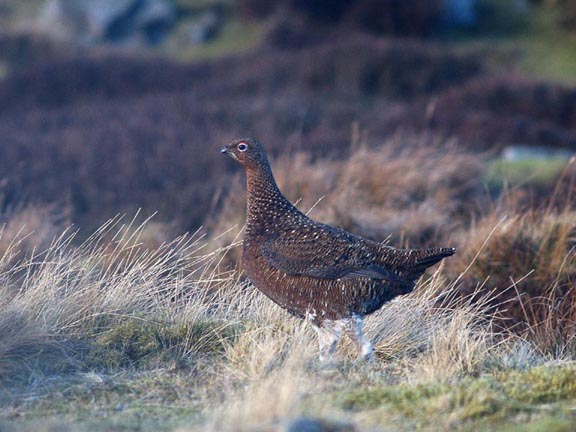 The shy moorland grouse. ISO 400, 1/125h f=4.5 FL = 150mm. Bokeh is reasonable.