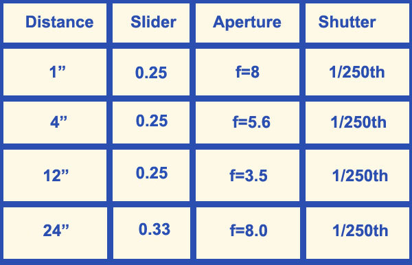 To set you off I've included the table below with the settings for the 4 variables; in fact there are only two variables to start off with but I'm sure as you get more good results you will be altering all four to get the exposure spot on. This chart is designed around my experience with the T10 ring flash as this is likely to be the most common. However, the chart will give you a good head start for any of the OM macro/ring flashes. IMPORTANT: The chart below assumes ISO=100 on all E-Cameras.