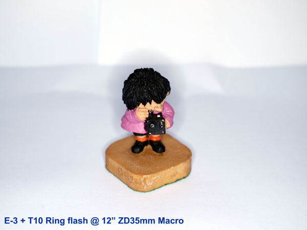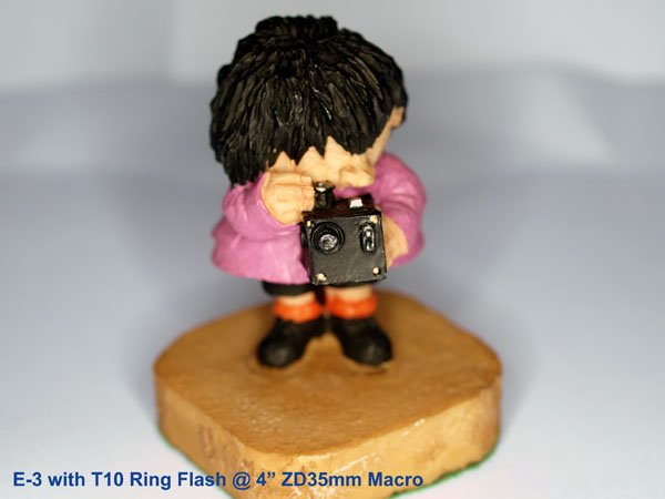 As said earlier the whole process sounds far more complex than it is; once you have experimented you will soon have a 'feel' for the job in hand and be altering the variables to give you maximum depth of field available, or the fastest shutter speed you can get away with by halving/doubling the other variables. On the subject of shutter speed 1/400th on the E-3 is very usable as the shutter vignette is only the slightest darkening along the bottom edge of the frame (maybe 5 pixels in height) and can be easily cropped out. The shutter on other E-system cameras is not quite as generous but does give a clean image at 1/320th. A high shutter speed is imperative if you are photographing live insects for example. Of course the precise correct exposure depends on the subject material, colour and the ambient light so further opening and closing of the aperture around the suggested guide is ultimately up to you. We have all the necessary feedback on the camera via the screen and histogram. Don't forget to leave your INFO button set to show either shadow, highlight or histogram so you can check the results immediately. I've found that different E-Cameras give very slightly different results so it is not really possible to provide guidelines for each model. The chart above will get you within 1 stop of the correct exposure with any E-Camera. On a final note the T Controller has the usual 'CHECK' lamp on the back panel that glows if the unit 'thinks' the exposure is accurate. Ignore this lamp, it tells you the exposure was correct in virtually all circumstances. There follows three quick and dirty examples using the above chart I undertook with a favourite macro subject of mine, 'Stinker' who stands 2" high. Distance setting noted on images, all else as per above chart for that distance. JPG's straight from the E-3, not processed only resized for web viewing.