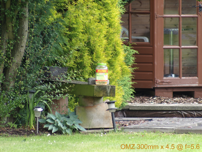 300mm x 4.5: Easy focus with MF assist 10X. A touch of purple fringing in the high contrast areas. The 300mm has delivered good results with all my cameras. The lens is quite large - probably a touch too big for the E-P1 - but fortunately has a tripod ring so you attach the camera to the tripod mounted lens! In the 5.6 test target area sharpness is very good to excellent; the result at f=4.5 is just a tad softer; the result at f=11 is identical. The EFL is 600mm making this lens a powerful and capable super-telephoto. It is usable wide open with care and there's not a great deal of difference as the aperture is stopped down; sharp to f=11~16.