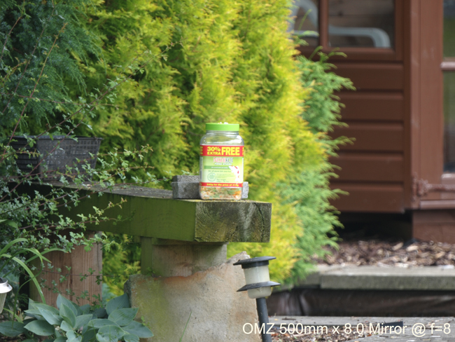 600mm x 6.5: Easy focus with MF assist 10X. This lens is rack and pinion focus. The 600mm is a huge lens and must be tripod mounted. The tiny E-P1 looks slightly ridiculous on the back of this lens! I shot 3 images at wide open, F8 and f11. There is no purple fringing that I can see. In the f8 test the target area sharpness is excellent; the result at f=6.5 is identical except for bokeh; the result at f=11 is also identical. The EFL is 1200mm making this lens a very powerful albeit huge super-telephoto. It is usable wide open and there's no appreciable difference as the aperture is stopped down; sharp to f=16~22. Ideally requires a gimbal tripod to enable swift movement. (This lens was several thousand pounds when new and can be bought for £6-800 today.)
