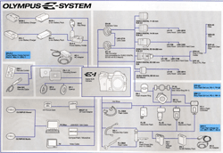 One of the central advantages the M1 displayed was that of vastly reduced noise and vibration from mirror and shutter mechanisms, a major criticism of all contemporary 35mm cameras. Anyone who has used an early to mid seventies non-Olympus SLR will know the problem, a resounding ‘kerrplunkkk’ and the disconcerting feeling that the shot you’ve just taken is spoiled by camera shake. Mr Maitani addressed this problem by designing the M1 from the ground up rather than taking existing mechanical solutions and modifying them. He looked at the whole concept of the 35mm SLR and tried many solutions to problems before being satisfied. He first turned his mind to his ambition of a full-frame 35mm SLR in 1966 and 6 years in development underlines just how enormous the task. A brand new shutter and oversize mirror box was conceived with air damping, new curtain drums, mirror lock and a new standard in field of view of 97% that almost reaches today’s WYSIWYG boasts.The E1 has a different set of problems to overcome though addressing the same basic issue – more accurate image capture. A major concern with all SLR’s is that of dust entering the body cavity when lenses are changed. The conventional SLR relies on the user to keep screen and mirror clean with soft brushes and blowers. Because the digital SLR uses a highly sensitive CCD to capture the image the pixels are open to contamination causing image deterioration or pixel failure. Previous cleaning methods are too crude. So Olympus has developed a membrane (Anti-Dust Function) that is self-cleaning (Supersonic Wave Filter - SSWF) to protect the CCD. Basically the membrane collects the dust and the SSWF twangs the membrane and the dust falls away. It is obviously far more complex than this and relies on hermetic seals and ultrasonic waves, but that’s the general principle. In addition the bright, easy-to-see viewfinder satisfies the demands of the professional photographer with a field of view that is 100% of the imaging area. Both M1 and E1 refer to their inherent ruggedness and the 1972 literature tells us ‘reliability is provided by the rigorous 100,000-time testing of the cameras vital shutter, winding and mirror mechanisms’. The E1 boasts ‘a durable shutter that can stand up to 150,000 snaps’ [snaps being the activation of shutter in anti-dust mode]. On the face of it, as system cameras, the M1 and E1 seem miles apart, though this deserves further consideration. The single page from E1 brochure shows the system, comprehensive yes but nowhere near the 280+ M1 system. In fact my scanner bed is not large enough to reproduce the M system diagram in full. | |