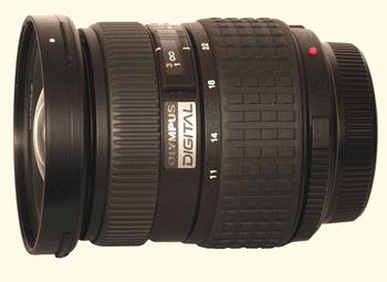 ERGONOMICS: Although only marginally bigger than the standard 14-54 zoom the 11-22 feels much chunkier. On the E-1 it is well balanced offering a substantial barrel to grip with the left hand (whether over or under grip is used) with a smooth but slightly noisy zoom action. The front element and frontal part of the lens physically moves outwards by some 10mm during a full zoom 'throw' from 22mm to 11mm. From 22mm to 18mm on the zoom ring all lens movement is internal, achieved by the inner element carrier moving backwards. At around 17mm on the zoom ring the frontal section begins its forward travel as the inner carrier continues backwards with both counter-moving parts reaching their maxima at the focal length of 14mm. The zoom ring travels some 47mm in its throw, slightly further than the 14-54mm's 45mm. Because of the englarged barrel on the 11-22, zoom throw feels substantially more than this 2mm suggests. Having 47mm of movement for just 11mm of focal length compared to 45mm for 40mm of focal length on the 14-54 zoom, focal length selection and adjustment is more generous and therefore more precise on the wide-angle zoom - how it should be, I suppose.
