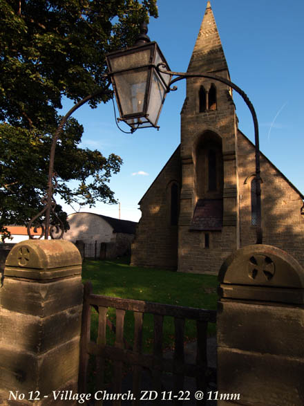 Large trees are difficult to photograph. I can never capture the tall and spreading majesty of a mature deciduous tree. This Chestnut is at least 80' high. With the ZD 11-22 at 11mm I could get very close indeed and tilt the camera back to get the tree top in. Look at the distortion in the house behind to judge the lens angle. Even so it still looks like a small tree! The following image is of Piercebridge village church: