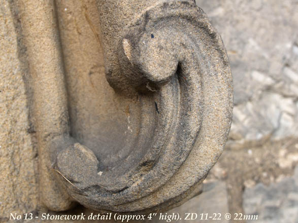 Like all these images I've not touched them other than re-size. I especially like this. Once again the ZD 11-22 in portrait mode at full 11mm has produced a delightful image. To give the eye a true vertical I use a line from the top of the 'spire' down through the support pillar of the double arched bell chamber through the centre of the deeply recessed narrow window just below the bottom of the recessed arch in the fancy gable buttress, and let the lens sort out the rest. The remaining verticals are distorted of course, but that's WA for you! On the outside I spot this bit of carved sandstone. This will demonstrate the close focus capability of this lens:
