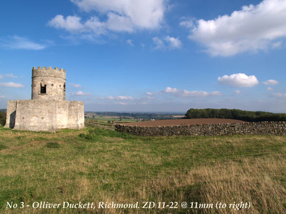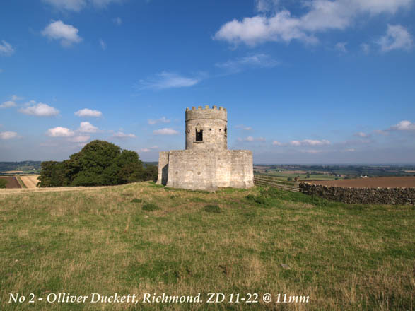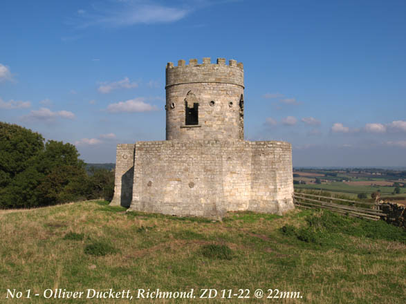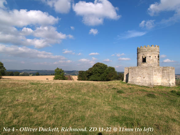 OUT ON TEST PART 1: OK, off we go. Let's look for something to show off the WA capabilities. Today is dry and bright though quite hazy, It is 2.00pm when I set off. The E-1's basic settings for this session are ISO = 100; WB = AUTO; FILE = SHQ; LENS FILTER = HOYA SKYLIGHT. Olliver Duckett is a 17th century Dove Cote (Shortened to Dovecott then bastardised to Duckett.) It lies on the western approach to Richmond and overlooks a splendid panorama of the upper reaches of the Vale of York. However, herein lies a problem. The Vale of York is low lying and therefore attracts fog and mist as well as the modern view spoiler - atmospheric pollution. Today is no exception as can be seen in the sample shots, though I've seen it far worse. I set my tripod up at about 30 feet away from the Duckett. Making sure the target is central I line up a horizontal grid line on my screen with the foundation line on the building. When I'm happy I set the ZD 11-22 to 22mm and take my first image: