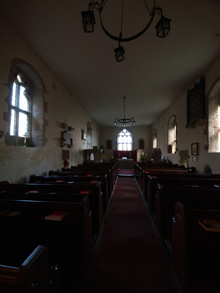 Behind the castle is the tiny church of St Oswald. The afternoon sun is almost gone and I pop in to see how the ZD 7-14mm handles low light situations. It is pretty dismal in here. This shot is handheld looking towards the altar: