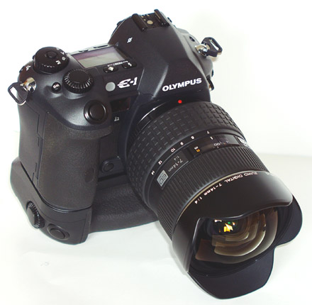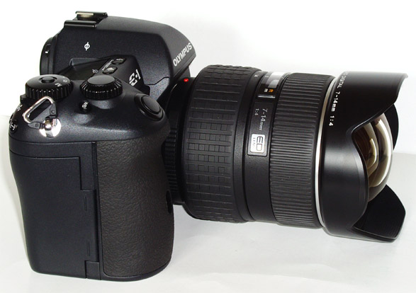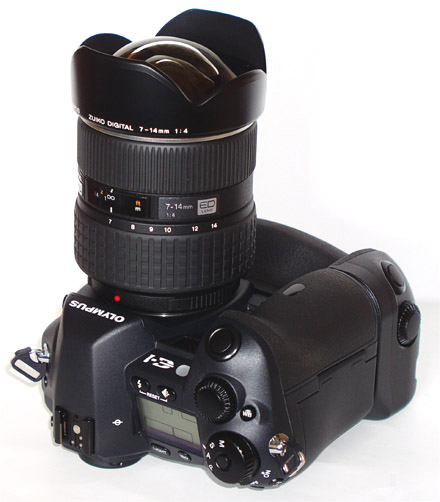 ERGONOMICS: Although I use my E-1 with the HLD2 grip as it provides superior AF speed and immense battery life, I'm first to admit that, to my eyes, it spoils the basic design look of the E-1. When any ZD lens is added to the 'gripped' E-1 body the combined package is immediately thrown out of balance, being front heavy. When putting it down the lens tips the whole thing forward meaning you have to take more care to avoid unnecessary damage to the front bezel of the attached lens. With the ZD 7-14mm attached its large physical weight of 780gm accentuates this and its permanently attached petal hood is at risk of possible breakage if not treat with respect. It may be that the design engineers have ensured the hood is strong enough to take this; however, as a design consequence I'm not over enthusiastic.