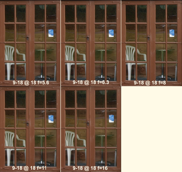 The following two sets of crops are taken from a series of images shot at 9mm and then zoomed into 18mm and taken at an aperture progression of F=4, 6.3, 8, 11, 16: