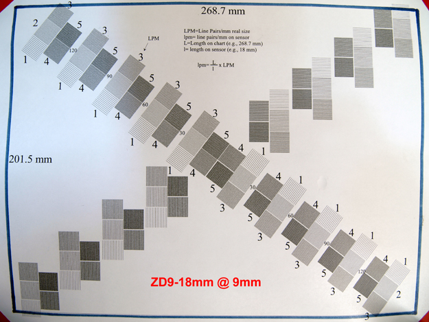 COMMENTS ON STANDARD TEST: These results are generally in line with most other 'budget' lens offerings from Olympus and follow the accepted norm of being a tad soft to soft wide open, sharpening up rapidly and in sequence as the aperture is closed up to around f=11 when softening sets in again as diffraction affects performance. During my time with the ZD9-18mm I found f=6.3 delivered the most consistent results. At 9mm your aperture choice is limited if you are strictly concerned about 'critical' sharpness. However, the results do sharpen up in post processing with some sensitive application of unsharp mask. However, at the 18mm end, sharpness performance improves significantly and good results can be had from apertures between f=5.6 and F=11. We simply cannot expect to have sharp images wide open from these 'budget' offerings compared to the 'top pro grade' series which also benefit from faster glass and weatherpfroofing. I'm pretty impressed with what I've seen so far. Of course the ZD9-18mm is not perfect; it has a bit of complex distortion and is a bit soft wide open - but generally it is a good performer. Please remember it is not that long ago that an OM Zuiko prime 18mm lenses would set you back £950 and the widest Olympus zoom you could buy was the OMZ28-48mm f=4 (equivalent to a ZD14-24). All lens design is a compromise but it's obvious to me this generation of lenses is far more sophisticated than the previous prime generation and the designers are really working those computer models hard to find the ultimate compromises. Things have surely moved on a pace.