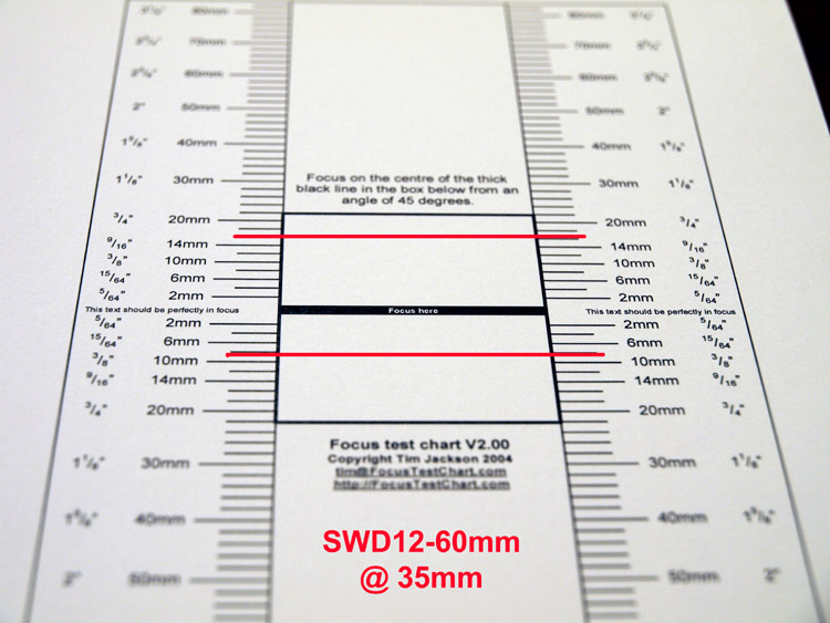OBSERVATIONS: As you can see the lens as tested shows no front or back focus tendency. The in-focus plane is not exactly centre (biased toward back focus) in relation to the FOCUS HERE line on the chart. However this may be the result of a slightly inaccurate 45° angle (the angle is critical). I've asked the designer of the test and chart for his observations and am awaiting his reply. In the mean time I've decided to run the test again with the camera at EXACTLY 45° to the table top. Here is the result: