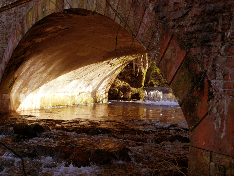 DYNAMIC RANGE: I have no means of measuring dynamic range, only my eyes. I went out to look for a shot that might stretch the sensors DR. I found this bridge in deep shadow on my side with bright sunlight streaming through from the other with the river flowing from almost black to white foam. This is the E-3 rendering:
