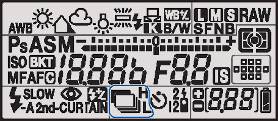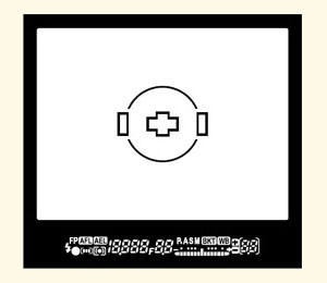 Left to Right Top: FP Flash, Metering Mode, Shutter speed, Aperture, Shooting Mode, Comp +/-, Buffer, IS, Auto ISO, Battery. Left to Right Bottom: Flash ready, AF confirm, Flash comp, AE Lock, WB, Exposure, Bracket, ISO sensitivity.