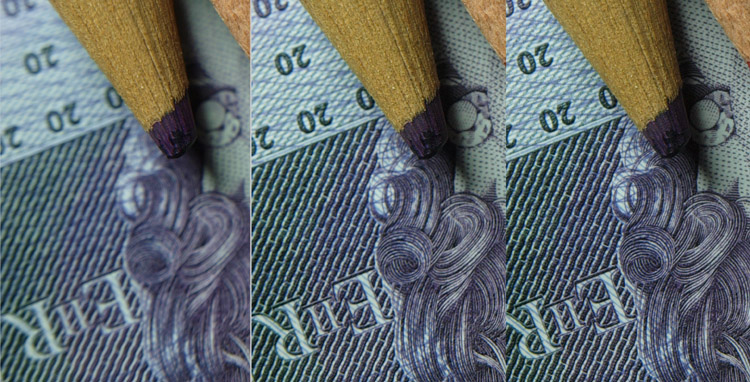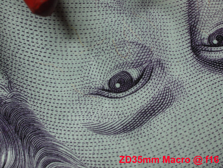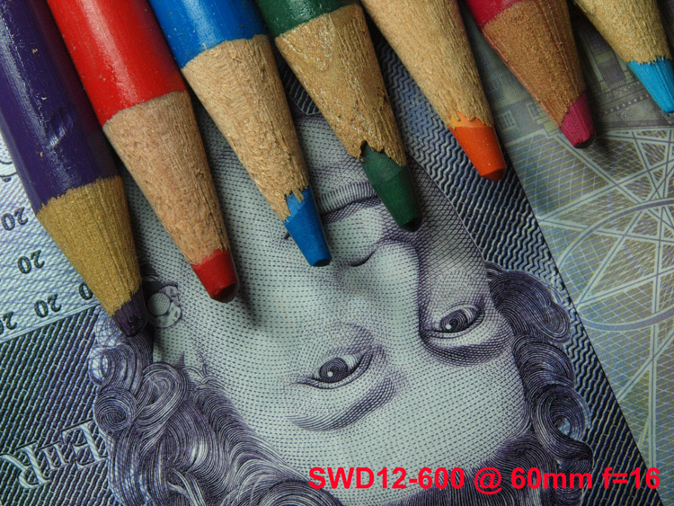 CRITIQUE: I cannot really express how impressed I am with this lens' close-up ability. This is simply stunning for a 'kit' lens, albeit an expensive one. Close focus ability is best of any of the ZD zoom lenses I've tested so far and the resolution it delivers is on a par with the ZD35mm Macro. At 50mm from the target you need to be careful with your lighting and of course the flash cannot be used. The distance from the focus point (blue crayon, centre) to the flat surface of the bank note is 3mm so you can see how shallow the DofF is with the lens at f=4. It does sharpen up well at f=8 and I cannot see (at full size anyway) any evidence of diffraction in the f=16 rendering. Looking at the final image, that from the ZD35mm macro lens (an absolute bargain by the way) the SWD12-60mm does very well and provides sharp enough images to allow you to cropping out to between 1:4 or 1:2 before significant loss of detail. With capability like this do you need a dedicated macro lens? I may do some further tesing to compare the output from the SWD12-60mm (and ZD35mm Macro) against what I consider to be the best Macro lens made, the OMZ90mm x 2.0 and it's smaller sibling the OMZ 50mm x 3.5; but that's for a later time. Judging by these results the OMZ's have a lot to do!