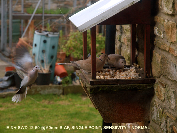 CRITIQUE: Given the subject and the conditions being less than ideal plus I was shooting through glass these turned out not so bad I think. At ISO 400 and -0.7 compensation I still had insufficient shutter speed to stop the wingbeat and there's a little movement blur on the bird in flight head. However I could have tried all afternoon and got nothing like this had I tried to focus on the incoming bird - they are simply too quick. The point I'm making is that the AF nailed the subject (closest bird) which was also squirming about on the table and I relied on a shallow depth of field to put the incoming bird into reasonable focus. It's no show winner that's for sure but I got the sequence. Whether the AF on the E-3 would have nailed focus on a bird in flight in these conditions is largely irrelevant because I tried a couple of times and decided disappointment lay that way, so I chose to work within the limits of the conditions, the camera and myself and got something half decent.