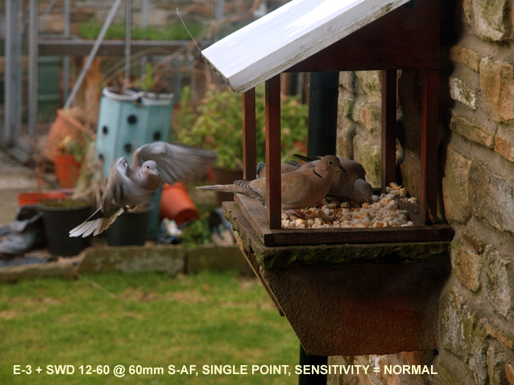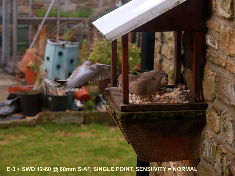 OBSERVATIONS DURING TEST: I set the camera to S-AF, AF point to centre, normal sensitivity and placed the centre point on the box in a vertical line shown by the right hand line and tried several AF's vertically. I recieved focus beep and green lamp on every occasion. Next I placed the centre point on the edge of the box in the middle of the two vertical red lines. I got the same result. Next I placed the centre point on the wall chart in a vertical line shown by the left hand red line. I received focus beep and green lamp BUT the box was in focus, not the wall. When I moved the placement of the centre AF point to the left of the vertical red line I got an AF fail (hunted in and out) because the area focused on has no contrast - just like my cupboard doors. Providing I kept the placement of the centre point any where along the centre of the two horizontal red lines running left of the vertical box I got no AF lock. I repeated the test running the opposite way with the same results. I changed only the AF point to 11, rest as was. I then repeated the placements of the centre point exactly as above. This time I received the focus beep and green lamp as long as one of the 11 points remained to the right of the vertical red line on the left of the box (even though the extreme right hand focus point was beyond the edge of the box). But as soon as the far right focus point was to the left of the left hand vertical red line I received focus beep and green lamp from one of the other 11 points that was now positioned over the edge of the deep grey line (or near to it), thus confirming positive and accurate AF. I repeated the test running the opposite way with the same results. Next I tried small sensitivity with centre and 11 points and saw no discernable difference. Next I tried the dynamic pattern and again found little difference to the result but do not understand why the focus point giving the confirmation does not light, only the centre point - this aspect of the mode is most confusing and could lead the user to 'believe' there is a AF fault. (I stopped using this pattern for this reason and not only for simple testing). I also have the Fn button set for AF home; this cycles between 11 point and whatever you set as your preferred AF point mode. I find this very useful especially as I no longer use the dynamic pattern. In dynamic pattern it was very easy to assume I had found an issue with AF, but on more repeat tests I am confident in saying it is the refusal to light the 'in-focus' point that leads to confusion and not a discrepancy of this mode, hence my refusal to use it. This arises from the fact that only the centre point lights leading you to think you are in single point mode; thinking this and then obtaining an AF lock well outside the centre point immediately, but wrongly, raises doubts as to AF efficacy as the dynamic mode is producing the AF pattern it should. CONCLUSIONS: To be honest, this is what I expected; the AF has behaved as it should. There is a ring running round each AF point larger than the point itself that is sensitive to the AF feedback (the area of this ring can be varied, hence sensitivity setting choice of small or normal) which means that your selected AF point can be slightly 'off target' but still find a lock and indicate that lock on the AF point nearest to it by lighting it up. The red vertical oblong represents this area covered by AF even though the points are just outside the marked area. In addition the refusal of AF to lock in test one (single point) was immediately corrected by test two that employs all 11 points. This confirms it was the nature of the target, not the AF mechanism, that caused the AF to fail. Is this not the way it is supposed to work? If single point fails to lock due to low contrast/low detail then switch to 11 points to give the sysytem better chance of obtaining a lock. If both fail then use the manual ring. My general advice is to avoid dynamic mode and set the Fn button preference to AF HOME which gives instant access to switch between single point and 11 point AF in one press. Leave it like this until you are happy that you fully understand how the AF system works in difficult situations before re-deploying dynamic mode just to avoid confusion while you get used to the system. AF IN REAL LIFE: On a not too bright Monday afternoon I watched some collared doves visiting the bird table outside my kitchen window and decided to try some test shots. It struck me that the birds plumage was not far away from the colour and texture of my study doors and with single point AF this may prove challenging for the camera. Now while these birds seem to flutter and fly slowly I found it impossible to follow them in flight to and from the table, so had to use a different method. When three birds were feeding I focused on the nearest and with both eyes open waited to see the fourth arrive. As soon as it entered my field of view I squeezed the shutter for a burst of 4 or five shots. I didn't use 11 points as I wanted the main focus to be the birds on the table; had they been out of focus as well as the incoming bird the shot would have been binned. These moments pass so quickly it was impossible to track the bird on the table as it was moving about as well, so once I had framed it was a matter of squeezing the shutter and letting the AF do its work whatever wandered in front of it. Hand-held, IS on, ISO 400, F4 at 1/380th. Here's the results: