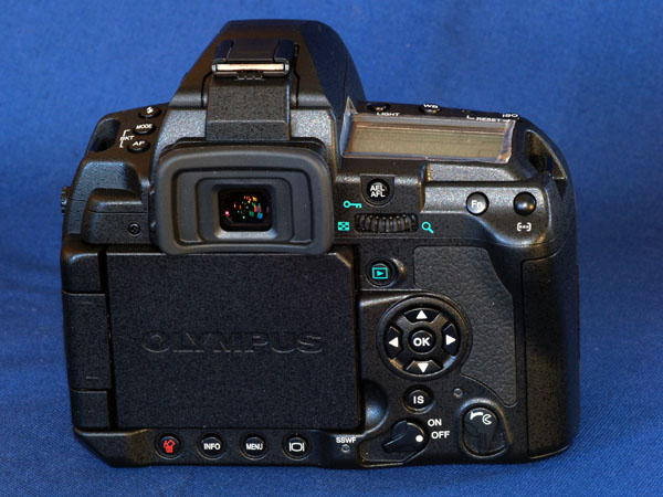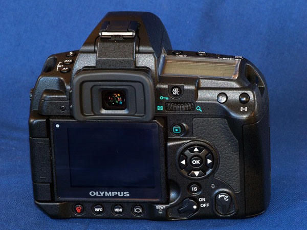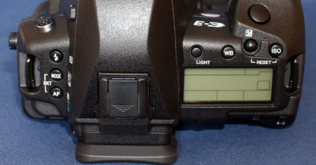I've already remarked on the small buttons. Though all the camera buttons communicate with the PCB through a membrane, the 4-way controller buttons seem additionally wobbly and lack any tactile or 'clicky' feedback. I prefer the ones used on the older E-1; but still this is a small point. The rubber eye piece VF surround is much larger than any other E-system machine and bigger even than the E-1's optional eyepiece. The actual exit pupil glass is exactly the same size as other 4/3rds cameras so allowing use of eyepiece accessories, though the final sighting pupil has a mask slightly larger on the E-3 reflecting its 1.15 magnification. The eyepiece dioptre and shutter knobs are hidden behind the large shroud of the rubber eyepiece and not immediately obvious. However, both can be operated easily and there's no absolutely need to remove the rubber shroud. The eye-piece shutter in particular works nicely with a flick of the left thumbnail.