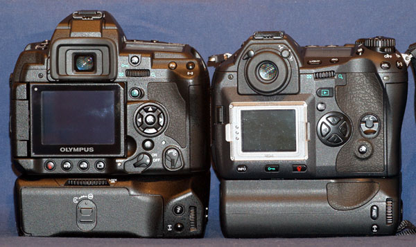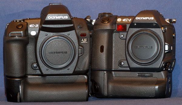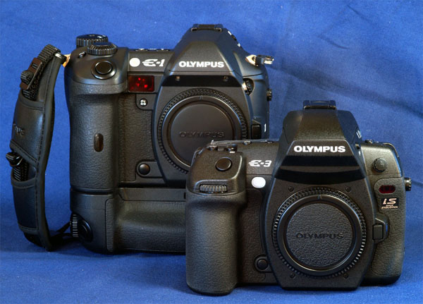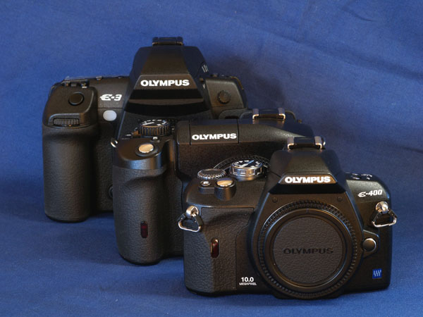 COMPARATIVE PHYSICAL SIZE: Size & weight: The E-3 is physically a large camera. On paper it may only be slightly larger than the E-1 but in reality it strikes me as altogether bigger. Comparing the dimensions the E-3 is only 4.2% larger in volume than the E-1. But weight wise the E-3 is 810g making it 23% or 150g heavier. The E-1 body with its HLD-2 power grip weighs 895g whereas the combined weight of the E-3 body with its HLD-4 easily breaks the 1kg barrier. And on top you have to fit a lens. Whether weight and bulk are significant to you is for you to judge. It is a major issue for me. Four-Thirds size promise: Perhaps this is the appropriate place to mention Olympus' 4/3rds advantage 'promise' of smaller sensor, smaller lenses, smaller cameras. The E-3 is no smaller than the Canon 40D or the Nikon D300. What's brought this about? In overcoming some of the 4/3rds disadvantages such as a small screen image, an oversized prism has been fitted to the E-3. To overcome the smaller sensors predisposition to noise at higher ISO values Olympus have fitted a sensor based Image Stabilization system that in conjunction with Zuiko Digital fast aperture lenses offers users the ability to capture images in dismal conditions without cranking up the ISO. Olympus claims the IS system alone provides a 5 stop advantage. These design progessions come with a cost and the cost, in the E-3, is body weight and bulk. However the size advantage in lens design and build remains as ZD and SWD lenses from Olympus are smaller and lighter than their cropped sensor competitors who rely in the main on lenses designed for 35mm. Olympus offer three ranges of lenses grouped by brightness and performance. Its Budget range offers the lightest and smallest of any makers lenses with IQ performance that belies their 'budget' tag. Here are some comparative shots against the E-1, E-330 and the diminutive E-400: