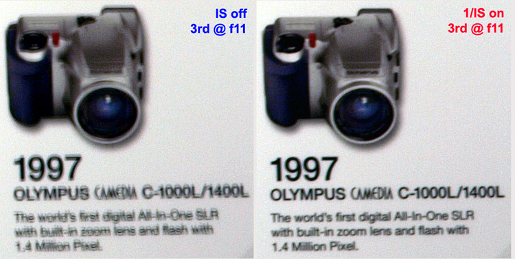In AUTO mode the in-camera software performs simple zoning with curves applied to zoned areas to enhance brightness. So far I haven't been able to deduce whether in HIGH & LOW KEY the camera is simply manipulating exposure or if there is in-camera software at work too. In each mode except NORMAL contrast adjustments (overrides) are not applied. This being so leads me to think in-camera software is at work in all modes except NORMAL. That being so and where you have applied your personal contrast settings to your Picture Modes this one setting is going to override those applied changes (unless I'm completely mistaken). This is a further reason why care should be taken applying any gradation setting other than NORMAL. IMAGE STABILIZATION: This function is provided in-camera as opposed to in-lens. This means that with all 4/3rds lenses (Zuiko Digital or otherwise) IS will work seamlessly due to the communication routines between the chip in the lens and the processors in the body. If you use legacy lenses (non-4/3rds standard) which are not 'smart' (i.e. chip-less) the IS function will not work. I believe there is no overwhelming technological reason for this; Olympus have chosen not to enable it. However, the new and larger viewfinder on the E-3 translates into better manual focusing when using most legacy lenses. The E-3 offers Image Stabilization on three levels; OFF, ON (both axes) and ON (horizontal axis). The sensor mount has gyroscopic sensors fitted that measure the amount of movement caused by hand-shake etc and to compensate (it is far more complex than this). The best analogy I can visualise is a helicopter that would roll, pitch and yaw but for the skillful pilot who can keep the machine absolutely still by counteracting each/all of the forces. The gyro's do that for the sensor. WHEN TO USE: For everyday use I'd suggest you leave IS in the OFF position. There is a lot of electronic and mechanical activity happening when it is switched ON that doesn't need to be draining power and wearing out if the camera is being held steady anyway. There's an old 35mm maxim of 'shutter speed equalling focal length stops shake' (one over the focal length) that is a good guide to enabling IS. In essence it means the longer the lens the higher the shutter speed required to prevent shake. Thus if the focal length is 150mm (on a 4/3rds lens) the shutter speed needs to be: (150 x 2) 300mm = 300th of a second or higher. If the ambient light is insufficient to achieve the shutter speed required by this maxim then switch ON the IS. In addition, if the camera is mounted on a sturdy tripod I'd suggest the IS be switched OFF. Of course there will be occasions when these guide lines should be ignored; that's why we think and why we practice. TEST METHOD: First off I have no equipment with which to test the claims made by Olympus of a full 5 stops advantage. And secondly nearly every test I've read on IS receives criticism that it lacks credibility, either in logic or science. Andrzej Wrotniak undertook a detailed appraisal of the IS capability of his E-510 which makes a lot of sense to me; you can read his findings here (highly recommended). I'm sure Andrzej will admit that was a lot of work and I simply haven't got the time to reproduce it here so I'm going to keep my IS experiment simple and the results to a minimum. All I've done is take some shots of a large chart on my office wall using the same focus point and the edge of the chart as a vertical guide, from a distance of about eleven feet. I'm using the SWD12-60 at the long end to see by how much I can reduce the shutter speed before I get apparent camera shake. I'm reasonably confident I can hand hold a shot zoomed to 60mm at around 1/25th second. I am sitting down (an advantage), using the viewfinder (called head stabilization) and keeping my elbows tucked in to my body. The E-3 shutter is delightful to use as it allows the most delicate of 'squeezes'. However, there are so many variables in this scenario it is impossible to suggest it is anything but a 'rough guide' to IS performance in this particular set of circumstances only. And you'll just have to take my word that I didn't cheat - what would be the point! Below is an image of part of the wall chart. You can see the crops of are taken from the far right of the full image, below the centre line