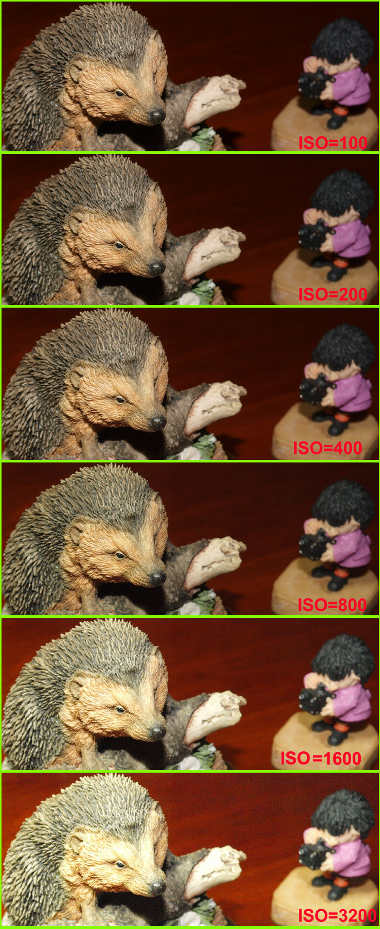 SENSOR GENERAL COMMENT: Because 4/3rd sensors are slightly smaller than APS (or other such cropped sensors) and one quarter the size of the full-frame sensor, they inevitably suffer from proportionately more noise. It is a fact of life and if you are looking for clean ISO6400 or above, you need to look to others than Olympus. 4/3rds is a compromise (as all cameras are) and whether the compromises the Olympus designers have chosen for the whole system suits you, or you can live with, is entirely up to you. Do your research, speak to folks who own/access two camera systems, look at your output requirements and above all do not listen to camera (box) salesmen! When Olympus went with the CMOS sensor it was for 2 reasons - to enable Live View and for better high ISO results. While Kodak improved the noise output on the 10MP CCD fitted to the E-400 it is generally accepted that the CMOS sensor fitted to the E-410/E-510 is superior as far as noise is concerned. So how does the E-3 perform? Certainly all the images from the Internet have demonstrated virtually no noise at ISO800, acceptable levels at ISO1600 and even 'usable' levels at top ISO setting of 3200. Generally I don't use high ISO rarely exceeding ISO800, and I suspect many other 'amateur' users don't either, but I do see the importance of high ISO performance for the professional. ISO PERFORMANCE TEST 1 INDOORS: METHOD: The table test is of my normal ceramic, artificially lit with the ISO cranked up 1 stop between shots. The crops are taken straight from the originals, re-sized only and put together for ease of comparison; there's been no processing whatsoever. Yes, the E-3 NR is set to OFF. I've especailly chosen to do this in artificial light because generally high ISO's are needed in interior circumstances with dismal amounts of other lights (theatres, boxing rings etc).