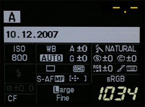 INFORMATION DISPLAY: The E-3 maintains the proper position for the information display being along the bottom of the optical viewfinder, not to the right as with the consumer models. This is one of my biggest gripes with the triple digit E-cameras. For those who wear spectacles I'd imagine the constant squinting to the right is tiresome. The E-3 display is comprehensive having icons for all exposure attributes including ISO (missing on E-1).
