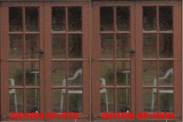 CRITIQUE (OUTSIDE): These results show how important exposure and light and shade make to the results. In exposure terms the white of the window surround is over exposed and the deep shadows are under exposed. This is reflected in ISO noise; the lighter the area the less prone to noise and vice versa. When shooting at high ISO be aware of the undue noise that will show in the darker areas of the image and, where possible balance this out by compensating. Of course there will be times when you cannot do this and will need to rely on noise reduction in post processing. This brings me neatly to in-camera noise reduction (filtering). NOISE FILTERING: The E-3 has four choices for noise filtering; Off, Low, Standard, High. Whether OFF is actually 'off' is subject of some debate; I'd imagine off means noise filtering is taking place albeit at a very low and discreet level. As I said earlier I believe it's best to leave these set to OFF until you are familiar with the effects. Using the same target as the ISO tests above, I set the E-3 to ISO 1600 and took four consecutive images with the Noise Filter set to each of the four choices to see the impact on the image, sharpness and detail. I used the darkest area as choice for the crops as this suffers most from intrusive noise.