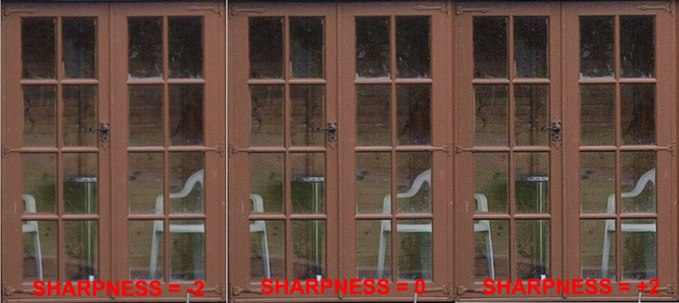 CRITIQUE (NOISE FILTERING): It's clear to see from the above crops (100%) the noise filter when applied does quite a respectable job. You can see for example the shape of the door handle emerging from the noise. Personally I think the impact on sharpness is acceptable (for this type of non-critical image), provides you detail previously partially obscurred and gives you the opportunity of applying your own regime of applied sharpening in post processing. I believe the levels applied by the camera settings are quite conservative yet very effective. However, I strongly recommend you do your own analysis before applying the NF function. IN-CAMERA SHARPENING: The E-3 has five choices for sharpening; -2, -1, 0 +1, +2. Using the same set-up as above I set the E-3 to ISO400 and took three consecutive shots with in-camera sharpening set to -2, 0, +2 to study the effects and to judge what settings are right for my use. It's imperative we all do this sort of test so we know what to expect out of our sophisticated machine. Here's the results: