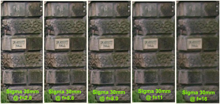 Observations on SET 4: Looking across the crops from the SWD12-60mm set to f=11, the loss of detail is more pronounced. At f=11 the SWD12-60mm lens can resolve only the house sign at 60 & 50mm; 35mm is really struggling for a sharp edge and wider still the sign is just a blur. Looking across the crops from the ZD14-54mm set to f=11, the loss of detail is more pronounced. At f=11 the ZD14-54mm lens can resolve only the house sign at 54mm & 50mm; 35mm is struggling for resolution and wider still the sign is just a blur. The best result of the crops at f=11 must go to the SWD12-60mm lens (by a fraction) as it seems just a tad sharper across the longest focal length crops. It seems pretty obvious that diffraction has started to kick in already and I can confirm the series I took with both lenses set at f=16 were pretty poor. My findings with this simple test have surprised me. I genuinely expected the new SWD12-60mm lens to significantly improve the results over the older ZD14-54mm, especially as I've always considered my example of the ZD14-54mm to be less than optimum. Certainly, these results show virtually no difference between the lenses, in fact the ZD at 54mm is capable of more resolution than the SWD at 60mm given the same aperture. It seems the sweet spot for both lenses is f=5.6 and diffraction kicks in around f=10, surprisingly early. This does not bode well for much higher density sensors for the 4/3rds system. I shall upgrade the firmware on the SWD12-60mm to version 1.1 and repeat these tests on a similar day. Personally I do not see an issue with long distance AF on the lens, but obviously I must upgrade the firmware. RESULTS FROM SIGMA 30mm: Before we leave this section I'm going to show the results from my Sigma 30mm set at f=2.8, 5.6, 8.0, 11 & 16 for perusal. I've always considered this lens as being pretty sharp, though not critically so. I suppose I use the Sigma 30mm as a 'control' lens because the results are predictable and to ensure I don't make some silly mistakes with other lenses.
