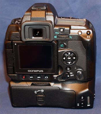 For all the bulk the grip adds to the already large E-3 I find it does help my handling of the camera. For example pressing the ISO button on the E-3 top plate involves some contortions with the index finger and an inevitable slight loss of grip on the body from the remaining fingers of the right hand. With the grip fitted its flat end provides a pivot point for the palm of the hand to squeeze against, thus resulting in no loss of grip/better grip. The additional contours of the battery grip provide new places for the fingers to gain purchase though the lack of a rubber for the right thumb is an omission. All in all I believe the grip is beneficial; certainly, the camera handles much better with it than without. Battery Performance: Something seems amiss. (Remember, the grip will work with only one battery). I only get the same amount of life from the grip with 2 BLM1's as I do with the camera without the grip (1 BLM1). The first time I used the grip with 2 batteries installed I was rather disappointed in its longevity. Thinking no more of it I removed the batteries for recharging. The first battery took the standard couple of hours to recharge but the second was in the charger only 10 minutes before the green light glowed. After the next low battery warning I simply changed the batteries around and continued shooting for another 300ish shots. Effectively it seems the grip is only a store for your spare BLM1 as they do not appear to be sequenced to switch between depleted and fresh. This must be a manufacturing fault with my grip, but I suspect from feedback I've already had I may not be alone!