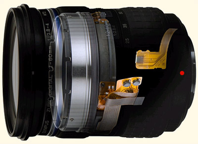 SWD12-60ED GENERAL: SWD lenses are recognised by a blue-chrome ring immediately in front of the manual focus ring and by a gold badge on the waist of the lens near the distance scale window. SWD lenses have mechanical manual focusing capability similar to that of the Sigma HSM range of lenses. Many 4/3rds users will breathe a sigh of relief to say goodbye to the older 'focus by wire' (FBW) as they proved less popular than the company anticipated. The benefit of SWD in normal use is that the user does not have to physically switch the lens into manual mode; the manual focus can always be operated. To me anyway, this is advantageous being more natural to simply tweak the lens focus ring without first having to enable it via a switch or even worse via the menu. Others may well differ as there is an argument that if you accidentally touch/turn the manual focus ring AFTER the camera has AF'ed (half press) there's a good chance your shot will be out of focus if you simply finish the exposure without refocusing. Yes, this could be so, especially the way zoom lenses tend to be cradled in the open left hand. My only SWD equivalent lens is the Sigma 30mm x 1.4 HSM and I find it easy and practical to use because the manual ring is always available; but on the other hand it has no zoom ring. Oh well, camera makers cannot be expected to cater for all eventualities! INSIDE THE 12-60mm: Olympus have combined outstanding ED glass and coatings, sophisticated optical design, five times zoom capability and high speed motors and communications to provide a high quality lens befitting the new flagship E-3. The company tell us the AF performance of new SWD12-60mm is the world's fastest and the lens has been specially designed to fulfill many photographer’s focal length needs in one superior package.