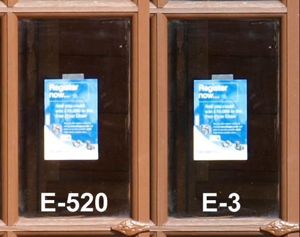 Personally I never use High & Low Key settings as there are easier ways to achieve the goal but I use Auto Gradation quite a lot and this is likely because I'm a great jpg fan. I rarely use the RAW format as I firmly believe that virtually all Olympus DSLR jpg engines deliver very high quality results straight out of the camera. Don't get me wrong, I can and have processed RAW images, but I rarely end up with a result that justifies the overall effort involved. But if the camera offers a setting that will enhance its already excellent jpg engine, as does Auto Gradation, I'm all for using it. Choosing jpg saves time, as does anything that enhances jpg's straight from the camera. I prefer to spend my time out and and about taking photo's rather than sitting in front of my PC processing RAW files. But, each to his own! Comparing Images from E-3 to E-520: I have done a quick series of comparative images with both cameras using the ZD50-200mm lens to see what the differences might be. I set the tripod up at 130 feet away from the target (an Olympus flyer less than A5 size) that was taped to one of the glass panels. Yes, I cleaned the glass! The first set is with the ZD50-200mm set at 50mm, with the crops at 100% shown below.