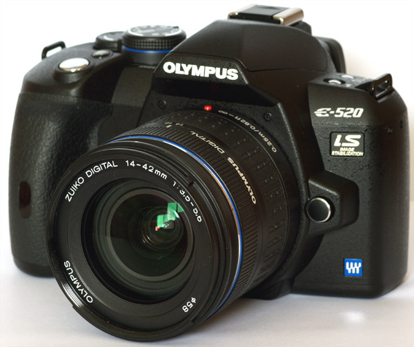 E-520: Weighing in at 475g compared to 460g (E-510) and 435g (E-500) and very little more with the standard ZD14-42mm zoom fitted, the E-520 is easy on the hands and fingers. The 10% increase in weight over the E-500 is due to the Image Stabilization system and larger LCD. Being used to the weight and bulk of the E-3 this camera is refreshingly light and easy to handle. The E-520 takes the 'standard' larger Olympus DSLR battery, the BLM1, that provides plenty of power for the all but the heaviest days shooting (rated in excess of 600 shots). Olympus do not make a battery grip for the camera but I dare bet one will be available from China - OwnUser - soon enough, though I cannot really see the advantage of adding weight and bulk to this class of DSLR. Its attraction is its lightness and good handling.