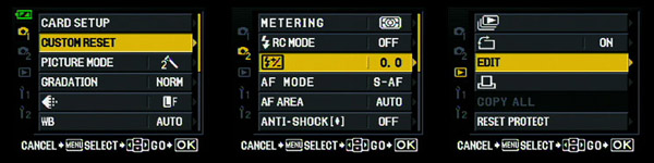 CAMERA 1 * Card setup (All erase, format) dependent on card selected (see SPANNER 2, choice 2) * Custom reset: (Reset, reset 1, reset 2) - reset to defaults or to the settings of your choice (MyMode) * Picture mode: Vivid, Natural, Muted, Portrait, Monotone, Custom * Gradation: Auto, Normal, High key, Low key * Image quality: RAW, Large/Fine, Large/Normal, Medium/Normal, Small/Normal, RAW+L/F, RAW+L/N, RAW+M/N, RAW + S/N) JPEG size & compression customizable * White balance: Auto, Sunlight, Shade, Cloudy, Tungsten, White Fluorescent, Neutral White Fluorescent, Daylight Fluorescent, One-Touch, Color Temperature * ISO sensitivity: Auto, 100, 200, 400, 800, 1600 * Noise reduction: On, Off, Auto (long exposures only) * Noise filter: Off, Low, Standard, High (determines noise reduction applied to images) CAMERA 2 * Metering: ESP+AF, ESP, CW, Spot, Highlight Spot, Shadow Spot * Flash RC mode: On/Off (controls wireless flashes FL36R/50R * Flash exposure compensation: -3EV to +3EV by 1/3EV increments * AF mode: Single AF, Cont. AF, Manual focus, Single AF + MF, Cont AF + MF * AF area: Auto, Left, Center, Right (VF only) * Anti-shock: Off, 1 - 30 secs selectable (Olympus' Mirror lock Up) * AE bracketing: Off, 3 frames/0.3EV, 3 frames/0.7EV, 3 frames/1.0EV * WB bracketing: Off, 3 frames/2 steps, 3 frames/4 steps, 3 frames/6 steps (various WB bracketing options) * Flash bracketing: Off, 3 frames/0.3EV, 3 frames/0.7EV, 3 frames/1.0EV REVIEW * Slideshow: 1, 4, 9, 16, 25, 49, 100 frames (selectable number of screen images shown) * Auto rotate: On/Off) (change captured portrait orientation) * Edit: Choices over these: RAW Data Edit and JPEG edit: Shadow Adjustment, Redeye Fix, Crop, B&W, Sepia, Saturation, Resize * DPOF print marking: One, All * Copy all: Copies from one memory card to another (xD to CF) * Reset protect: On/Off)