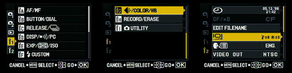 SPANNER 1 (i) AF/MF: * AF illuminator: On/Off) * Focus ring: Counterclockwise, Clockwise (direction of FBW focus rings) * Reset lens: On/Off (resets lens to infinity when camera turned off) * Bulb focusing: On/Off (selectable focus during bulb exposure) * Live view AF: AF sensor, Hybrid AF, Imager AF (see above) (ii) Button/Dial: * Dial: you may select what the command dial controls viz: (a) Program mode: Program Shift, Exposure Comp (b) Aperture priority mode: Aperture, Exposure Comp (c) Shutter priority mode: Shutter speed, Exposure comp (d) Manual mode: Shutter Speed, Aperture) * Dial direction: Dial 1, 2 (selectable for effect of turning the dial L or R * AE/AF lock viz: (a) S-AF: Mode 1, 2, 3 (b) C-AF: Mode 1, 2, 3, 4 (c) MF: Mode 1, 2, 3 * AE/AF lock memory: On/Off (makes button sticky) * Function button: Face Detection, Preview, Live Preview, One-touch WB, Home Focus Point, Manual Focus, RAW quality, Test Picture, Program Mode, My Mode, Off (programmable button) * Drive button: Drive, AF Area, AF Mode, WB, Metering, ISO (programmable button) * My Mode setup: My Mode 1, 2 (programmable modes for favorite settings) * Button timer: Off, 3, 5, 8 sec, Hold (direct button active memory) * AE/AF lock: Function Button swap: On/Off (programmable button swap) * Arrow pad lock: On/Off (prevents accidentally changing four-way controller settings) (iii) Release/Continuous: * Release priority S: On/Off (whether focus lock is required for shutter release) * Release priority C: On/Off (as above, but in continuous AF mode) (iv) Display/Sound/PC: * Beep: On/Off * Sleep: Off, 1, 3, 5, 10 mins * Backlit LCD: 8 sec, 30 sec, 1 min, hold * 4 hour timer: Off, 4 hr (turns camera off after 4 hours) * USB mode: Auto: Storage, MTP, Control, Easy PictBridge, Custom PictBridge * Live view boost: On/Off (boosts screen brightness in low light in live view) * Face detection: On/Off (in live view mode) * Frame assist: Off, Grid, Golden section, Scale (see above) (v) Exposure/Metering/ISO: * EV step: 1/3, 1/2, 1 EV (selectable) * ISO Auto set: 100 - 1600 (selectable top limit of Auto ISO) * ISO Auto: P/A/S/All (when auto ISO is available) * AEL metering: Auto, CW, Spot, Spot Highlight, Spot shadow * Bulb timer: 1, 2, 4, 8, 15, 20, 25, 30 mins (selectable time for bulb mode) (vi) Flash custom: * X-sync: 1/60 - 1/180 sec * Slow limit: 1/30 - 1/180 sec * Flash exp comp + exp comp: On/Off (selectable flash exposure compensation linked to exposure compensation) * Auto pop-up: On/Off (selectable if flash pops up when required in auto or scene mode) (vii) Quality/Color/WB: * All white balance compensation: Choices to set: All set: -7 to +7; and All reset * Color space: sRGB or AdobeRGB * Shading compensation: On/Off (to help reduce vignetting) * Image quality set: Large/Medium/Small, Superfine/fine/normal/basic (selectable size and compression) * Pixel count: (selectable resolution for following sizes): Middle: 3200 x 2400, 2560 x 1920, 1600 x 1200; Small: 1280 x 960, 1024 x 768, 640 x 480 (viii) Record/Erase: * Quick erase: On/Off (should camera prompt you to delete photo?) * RAW+JPEG erase: JPEG, RAW, RAW+JPEG (decide what is removed when you delete a RAW+JPEG photo?) * File name: Auto, Reset * Priority set: No, Yes (first position of the highlighted box in All Erase or Card Format) * dpi setting: Auto, Custom (allows setting of dpi) (ix) Utility: * Cleaning mode: (mirror lock up for manual sensor cleaning) * Scene mode swap: Sport/Night Portrait, Underwater wide/macro (allows swapping on mode dial) SPANNER 2: * Date/time: (to set) * CF/xD: (which card slot to use) * Edit filename: (change file naming system) with choices for AdobeRGB: Off, A-Z, 0-9; and sRGB: Off, A-Z, 0-9 * LCD brightness: Choices over Brightness: -7 to +7 and Color balance: -7 to +7 * Language: * Video out: NTSC, PAL * Rec View: Off, Auto play, 1 - 20 secs (image review; auto play option enters playback mode after image recorded) * Pixel mapping: (Re-maps/maps out bad pixels on the sensor) * Firmware: (shows current firmware version of body and attached lens)