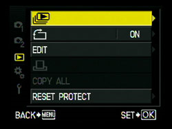 Slideshow: 1, 4, 9, 16, 25, 49, 100 frames (selectable number of screen images shown) On/Off: (change captured portrait orientation) Choices over these: RAW Data Edit and JPEG edit: Shadow Adjustment, Redeye Fix, Crop, B&W, Sepia, Saturation, Resize DPOF print marking: One, All Copies from one memory card to another (xD to CF or vise versa) RESET PROTECT: On/Off