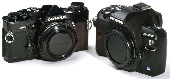 When we see comparable cameras together it is very plain how much progress has been made. Olympus had a disastrous dalliance with Auto-Focus for many reasons, one being that Mr Maitani is said to have disliked the technology. (I suspect the Honeywell suit was more to blame!) That said the OM707 was most unsuccessful not because of the lenses but more due to the unreliable vertical shutter mechanism that was a departure for the company. Actually, the AF lenses were not bad; but note they are not designated OM or Zuiko, only 'Olympus Lens' appears on the side of the barrel. There is no competition here whatsoever. The E-400 is simply better all round. Smaller, lighter, better specified and more capable. SPECIFICATION COMPARISON: Much as I'd like to sit down and compare the E-400 to the OM2n from a specification aspect, I suspect we all know the answer. Today's offering is more sophisticated by far. The OM2n was a fabulous camera for its time offering on Auto an aperture preferred metering system with a selectable manual (shutter preferred) mode; an elctro-magnetic controlled shutter for accuracy with a manual backup; ASA 25-1000; compensation +2 to -2; shutter range of several minutes through to 1/1000th second; Off the film metering; a world beating flash control system and of course the full OM range of lenses and accessories. The only areas where the E-system cameras cannot compare is (1) an equivalent to OTF metering at the point of exposure: no doubt the designers will get round this in some way. We have taken a small step back by losing this facility. (2) No mirror lock-up: this is a serious omission in my opinion but if the camera is destined to be an entry level machine I can understand the thinking. To counter these shortfalls I could offer the argument that the E-400 has the equivalent of an internal motor drive with its buffering facility, whereas the OM required either an external winder or a full blown motor drive. However, I'm not going to push the comaprison any further; they both take great photographs in the right hands. Personally, since going digital in 2000, I've hardly used any of my film caneras. CONCLUSION: There's little I want to add except one major observation about the general aesthetics of the E-400 (and presumably all that follow). All the E-System predecessors suffered from a lens mount bias toward the users left. This was particularly noticeable on the E-500, to the point where it almost caused ugliness. While the E-400 has almost overcome this it still has a little way to go before it matches the ever so slight assymetrical look of the OM bodies. So, yes, I think within the confines of this article I can favourably compare the E-400 to an OM(2n) anyway. However, from my personal point of view I haven't fallen for the E-400. For me it is too small and light with too little real estate to grab hold of. I miss a grip but can see how its inclusion would have spoiled the overall objective. I find the strap hangers a damn nuisance and I'm not keen on the eye relief. But I can see that it and its sibling will add hugely to Olympus' success.