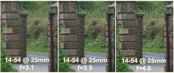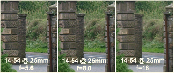 STANDARD TEST: I set up the tripod to do some test shots against my normal target which is a stone gate pillar with a small house sign (landscape A4 size) that is some 220 feet from the camera-on-tripod position. I decide to compare the pancake against the ZD14-54mm set to 25mm at a selection of apertures. First I mount the ZD25mm. For all sessions of testing I use the E-3 with these base settings: A mode, ESP, ISO = 100, WB AUTO, NR= OFF, S-AF, File = L Super Fine JPG, COMPENSATION = 0; tripod mounted and shutter tripped with RC-C1 (Generic version of RM1) remote.