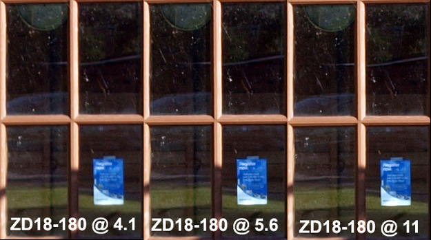 OBSERVATIONS ON STANDARD TEST: Comparing the two sequences above you can see there is not a great deal of difference in performance between the prime and the zoom. Both are soft wide open at 25mm and both sharpen up much the same as the apertures are closed. There is a slightly better performance from the ZD14-54mm at f=8.0 but you need to see the full images to discern the difference. For all intent and purpose they perform at a similar level. Bear in mind that we are comparing a 'Pro Grade' zoom to a 'budget' grade prime (and a simple optical design at that) with a pretty large price difference too. That the little pancake holds its own against the highly acclaimed (not necessarily by me) 'Pro' ZD14-54mm zoom is a good result and surpasses my expectations. Just a note about my example of the ZD14-54mm: Some of you will recall I had to return my original E-1 and lens for re-calibration. I have never been entirely happy with my ZD14-54mm since those early days. That said it does perform well against other 'Pro' grade lenses in various tests, so perhaps my skepticism is unfounded. COMPARISONS WITH OTHER LENSES AT 25mm: Perhaps it might be interesting to do some further direct comparisons of performance of this lens with other lenses, both ZD and OM. For this exercise I'm going to use the 25mm Pancake against the ZD18-180mm at 25mm and the OMZ 24mm x 2.8. As we know all these lenses perform best stopped down, so I'm going to restrict this test to wide-open, f=5.6 and f=11. Here's a different target (the notice in the window is 35 foot from the camera) with the objective being able to read the notice, so I've cropped out the area shown in red and put the three crops per lens onto one image for direct comparison. The title of the small notice reads 'Register Now' and towards the bottom are a series of tiny camera images in an arc.