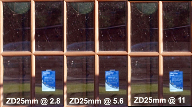 These results are generally in line with most other 'budget' or 'kit' lens offerings from Olympus and follow the accepted norm of being a tad soft to soft wide open, sharpening up rapidly and in sequence as the aperture is closed up to around f=11 and then softening again as diffraction sets in. During my time with the ZD25mm I found f=6.3 seemed to deliver the most consistent results.