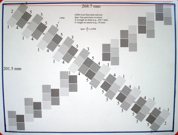 BARREL DISTORTION: I set up the tripod indoors and just fill the frame with this test chart. I endeavour to have the chart level and plumb, as well as the camera. I do not use flash. When complete I mark the captured image horizontal with two red lines above and below the rendered top line of the chart. Here's the result: