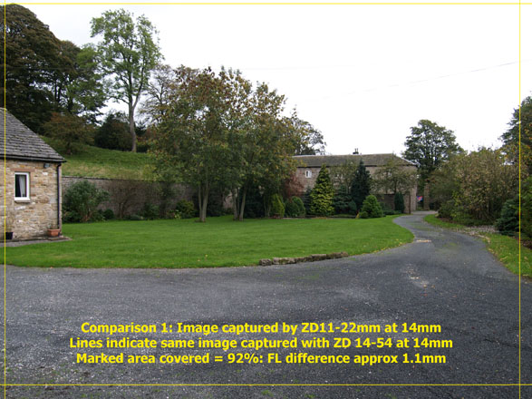 If you examine the above two shots it is quite evident that at 14mm the ZD11-22mm captures a wider angle than the ZD14-54mm across the frame but not so evident vertically. Having seen just this difference, I set to in Photoshop and make as accurate an overlay as I can of the image from the lesser ZD14-54 on top of the wider image from the ZD11-22mm. I mark the wider image with yellow lines that demark the extremities of the less wide image to accord with my findings as precisely as I can. I then compute the image sizes so I can make some calculations to show how much additional 'scene' is captured and, in approximate terms, how this equates to focal length.
