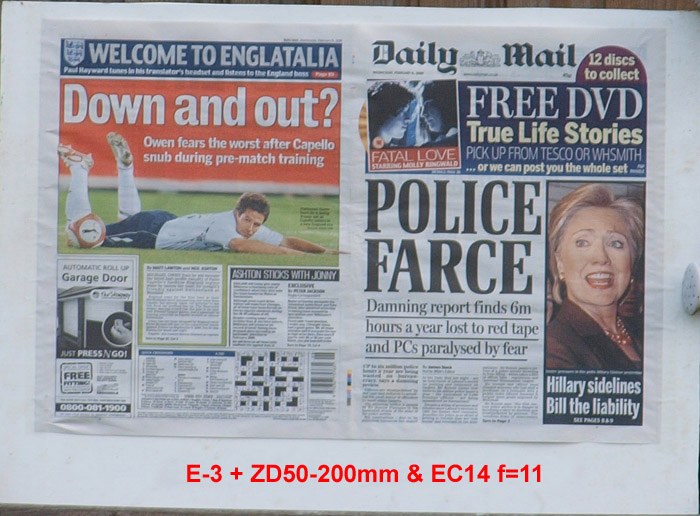 CRITIQUE: In the above series of six images I think the ZD50-200mm in combination with the EC14 Teleconverter does quite a good job bearing in mind the difference in price between the two lenses (lens combinations.) The ZD300mm costs around £4,500 whereas the combination will cost you £1000. Is there £3000 worth of difference - well only you can judge. Certainly in the first three crops (f=4.9, f=5.6 and f=8) there is little to compalin about; these are better than the ZD300mm on the E-1. Compared to the results from the ZD300mm on the E-3 I think they stand up quite well. OK they are a tad softer with marginally less bite but you can still easily read the selected text without difficulty. Is the combination on the edge of its resolving power? Quite possibly considering the amount of glass the light is coming through (22 elements in 20 groups) there's a lot of potential for a bad surface. But we won't know until the next generation of E-cameras arrives with increased pixel counts. Again, and just the same as the ZD300mm performance on the E-1 and E-3 diffraction kicks in around f=11 to f=12 but in this case the EC14 magnifies the diffraction effect making it appear much worse in the crops at f=16 and f=22. Don't forget the defocused areas produced by the ZD50-200's 7 bladed diaphragm plus EC14 will not be as well achieved as the 9 blades of the ZD300mm's diaphragm. Unfortunately we don't have an example to show you. So what's the difference? Wide open the combination sets off at f=4.9 as opposed to f=2.8 with the ZD300mm. That's very nearly a stop and a third. Therein lies the significant difference, the ZD300mm is innately faster. The apertures level out at f=5.6. Performance from the combination is surprisingly good, way better than I'd anticipated compared to the Big Tuna. But please remember we have only examined the centre of the images, corner resolution may not be as good.