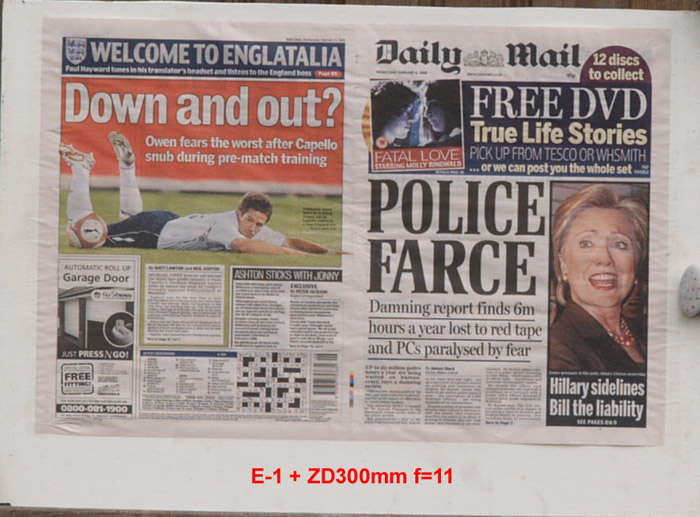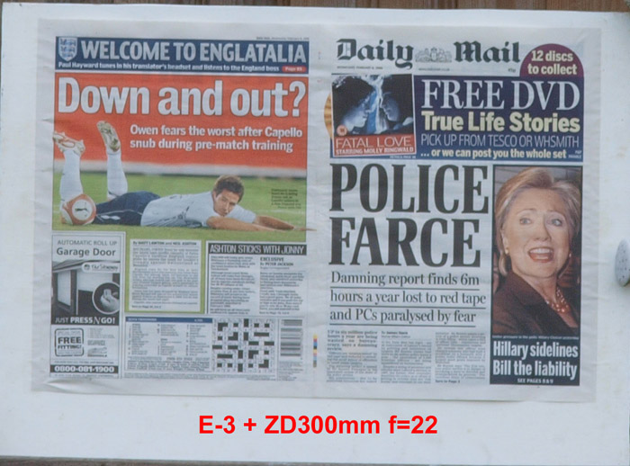CRITIQUE: I've judged these results by looking at the GARAGE DOOR advertisement in the bottom left of the paper. The words above the illustration are: AUTOMATIC ROLL UP and if you compare how easily,or otherwise, you can distinguish this lettering will give you an idea of how good the delivered resolution has been. It's plain to see the sensor is the bottleneck here with the lens resolution far outstrippimg that of the 5MP sensor. While the images are quite good, even at the sweet spot of f5.6 ~ f8 they are a little 'lacking' in 'bite'. However, when compared to the 10MP sensor on the E-3 these are not too bad at all. Remember that to double the resolution you need to quadruple the pixel count.