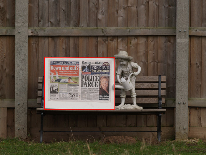 TARGET & SETUP: Here is the target set up by Ken. Test exposures were done on an early February day in UK so the ambient light is diffuse resulting from a bright day with hazy sunshine. The tripod was approximately 30 yards from the target and both camera shutters were triggered with a CB1 remote control. The area edged in red is the cropping target.